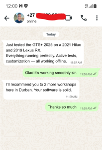 “Installed GTS+ 2025 and ran full diagnostics on a 2023 Prado. Worked like magic. Thank you Jaybee!”